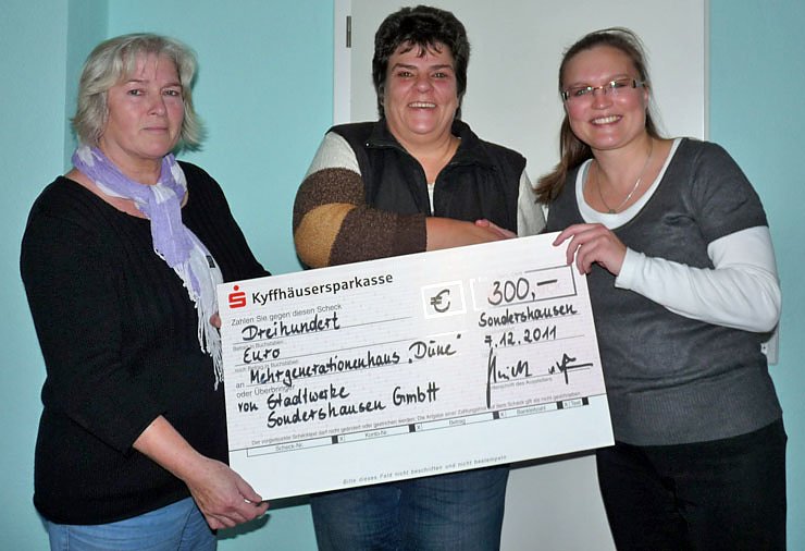 Die Düne e.V. ist eine gemeinnützige Einrichtung, die u.a. vom Bundesministerium für Familie, Senioren, Frauen und Jugend gefördert wird. Aufgrund der Entwicklung hinsichtlich der bewilligten Fördergelder seitens des Bundes und des daraus resultierenden Defizits haben sich die Stadtwerke Sondershausen GmbH gern dazu bereit erklärt, die Einrichtung mit einer Spende in Höhe von 300,00 Euro finanziell zu unterstützen.