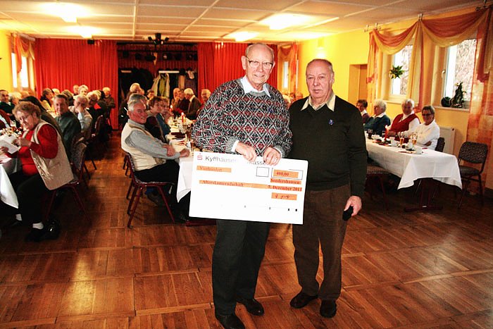 Für die aktive Vereinsarbeit der Alters- und Ehrenabteilung des Kreisfeuerwehrverbandes Sondershausen übergab der Geschäftsführer des Kreisverbandes, Kamerad Günter Herting, anlässlich der Weihnachtsfeier der Alterskameraden am Mittwoch, an den Vorsitzenden der Alterskameradschaft, Kamerad Gerhart Tittel, einen Scheck in Höhe von 400 Euro.