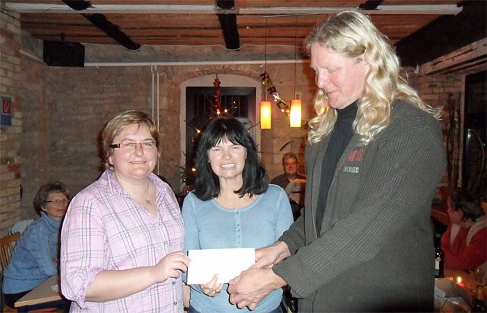 Ortsvereinsvorsitzende Sabine Bräunicke und Vorstandsmitglied Cornelia Kraffzick überreichten den Umschlag an Andreas Gothe vom Stadtjugendring. Andreas Gothe wird nun Kinder aussuchen und ihnen von dem Geld ein Geschenk zu Weihnachten kaufen.