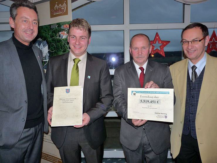 Gestern erhielt das staatlich anerkannte Sole-Heilbad Bad Frankenhausen den Fördermittelbescheid für den 4. Bauabschnitt des Kurparks in Höhe von 5.519.451,- Euro durch den Staatssekretär des Thüringer Wirtschaftsministerium Jochen Staschewski (li) überreicht. Den Förderscheck nahmen Bad Frankenhausens Bürgermeister Matthias Strejc (SPD), der Vorsitzende des Fördervereins Solefreibad Dr. Andreas Räuber und der Vizelandrat des Kyffhäuserkreises Georg Schäfer entgegen.