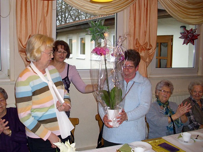 Als neue Vorsitzende des WB 4 wurde Christa Groß gewählt. Sie ist bereits seit vielen Jahren Mitglied des Vorstandes und übernimmt nun diese neue Aufgabe. Nach diesem offiziellen Teil ging es zum gemütlichen Teil über. Nach Kaffee und Kuchen vom Juventas boten Helga und Heidrun von den Bebraer Singvögeln ein buntes Programm zum Mitsingen und Sketche zum herzhaften Lachen. In einem Sketch eines Opernbesuches als älteres Ehepaar stellte sich letztendlich heraus, dass der Gatte (gespielt von Heidrun) zwar gebadet hatte und neue Sachen an hatte, aber die alten und penetrant nach Käse stinkenden Socken ebenfalls noch bei sich hatte. Als Beweis ließ sie alle Senioren auch einmal an den Socken schnuppern, die hier wirklich mit einem sehr herzhaft "duftenden" Käse gefüllt waren.