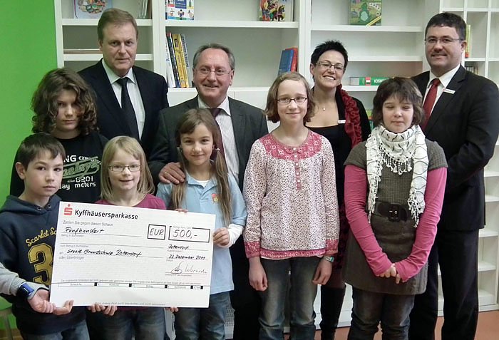 Autor: khhDie Grundschule Bottendorf eröffnete vor Kurzem die neue Schulbibliothek. Kurz vor den Weihnachtsferien bekam diese von Seiten der Kyffhäusersparkasse die finanzielle Grundlage zur Anschaffung naturwissenschaftlicher Nachschlagewerke, Ermöglicht wurde dies durch die freundliche Unterstützung von Herrn Ulrich Heilmann, Vorstandsvorsitzender, Hans-Joachim Warnecke, Vorstandsmitglied, sowie den Vertretern der Filiale Roßleben Katrin Weise und Ronny Greschuchna. In Kürze werden die Grundschüler in der Lage sein, sich in der neuen Fachliteratur u.a. über die Tier und Pflanzenwelt der Bottendorfer Höhen im Haus zu informieren.