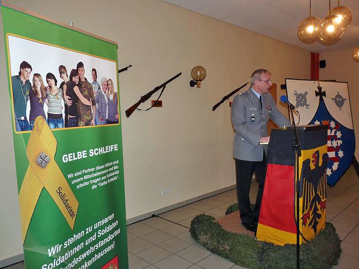 An diesen Kreis richtete sich auch sein Dank, dass man gerade im vergangenen Jahr viel Solidarität mit der Bundeswehr gezeigt hat. Sein besonderer Dank ging aber an die Bad Frankenhäuser Bürger und Geschäftsleute. Mit dem Zeichen der Gelben Schleife hat man hier nicht nur moralische Unterstützung gegeben, sondern auch materielle Unterstützung für die Familienbetreuung der Bundeswehrangehörigen. Es gibt kaum ein Geschäft in Bad Frankenhausen, wo man nicht das Symbol der Gelben Schleife bemerken kann.