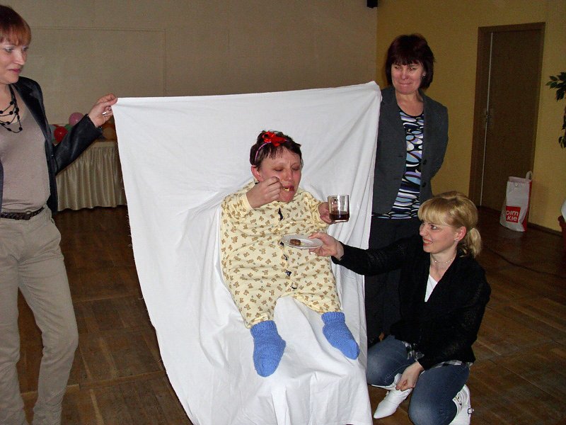 Spaß und herzhafte Lacher waren garantiert. In einem Sketch zum Beispiel hatten die Frauen der "Kontakt"-Gruppe auf ein weißes Bettlaken einen Baby-Strampler genäht und einen Ausschnitt für einen Kopf gemacht. Zwei Frauen saßen dahinter, die eine guckte mit dem Kopf (als Babykopf) durch das Tuch und ihre Hände waren als Babyfüße eingekleidet. Die andere Frau hatte nur ihre Arme von hinten durch das Tuch gesteckt und führte so die "Armbewegungen" passend zum vorgelesenen Text aus. Spielerisch wurde hier der Tagesbeginn von Christa Groß nachgespielt, beginnend beim munter werden, gähnen und strecken, schminken mit Spiegel, Einnahme eines Frühstücks bis zum "stadtfein" machen und ausgehen. Die Lachmuskeln und das Zwerchfell wurden dabei arg strapaziert, es war so herrlich und originell und einfach Klasse.