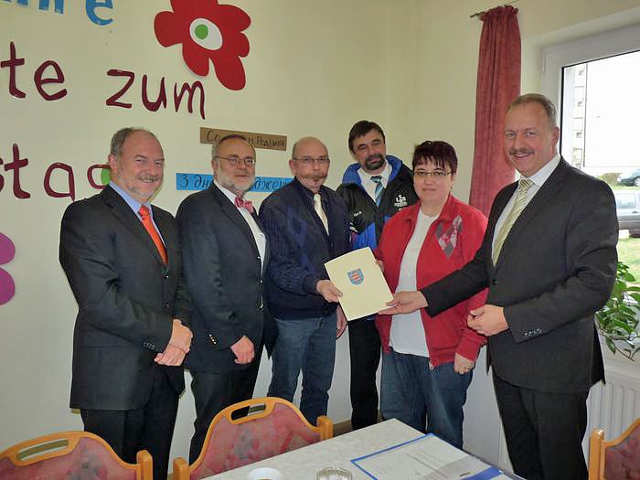 Landtagsmitglied Manfred Scherer (CDU), Landrat Peter Hengstermann (CDU), Geschäftsführer Lothar Hildesheim von der FAU, Bürgermeister Joachim Kreyer (CDU), Katharina Weizel von Aussiedlerinitiative Kontakt und Innenminister Jörg Geibert nach der Übergabe des Bewilligungsbescheides.