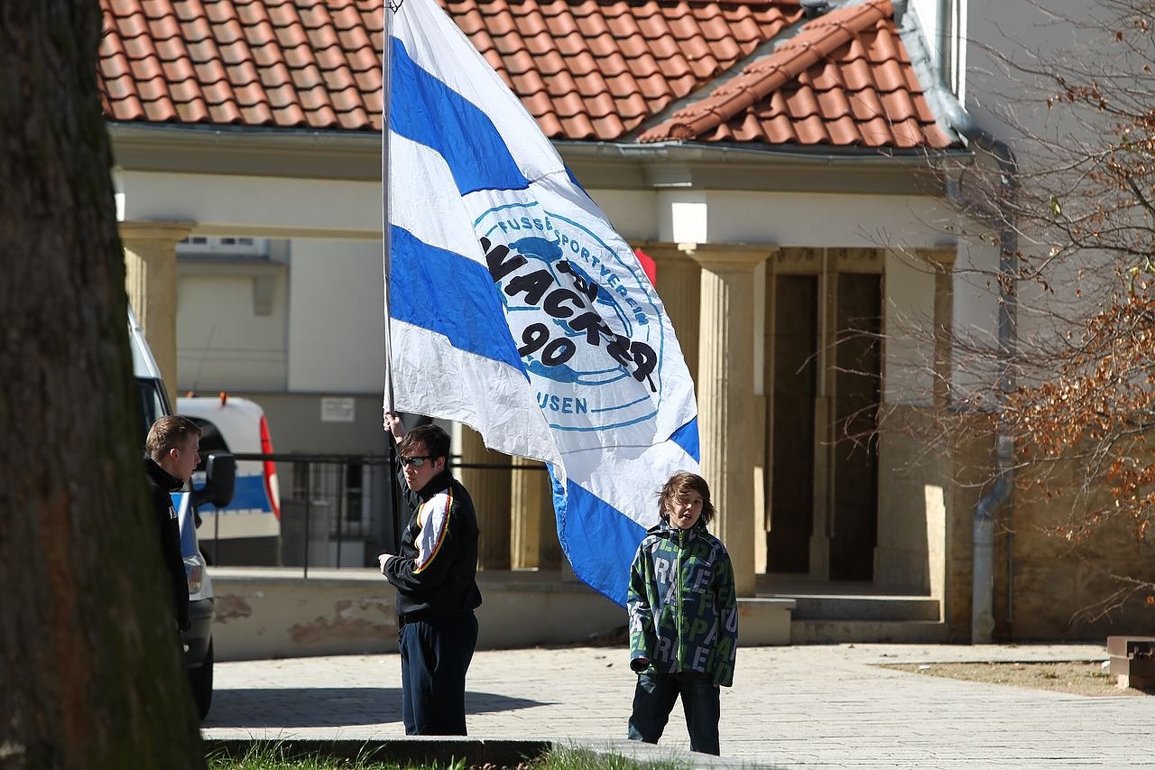 Das einzige Winkelement, was am Theater umhergewunken wurde, war eine große Wacker-Fahne. Dort hatten sich die Fans der Wacker-Front getroffen, um dann unter Polizeiaufsicht in Richtung AKS zu marschieren.