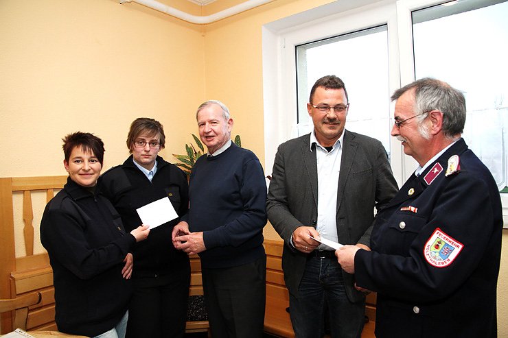 Übergabe von Geldprämien v.l. Jugendwarte Claudia Auer, Katrin Rohrmann, Ehrenmitglied der Feuerwehr Dieter Grüneberg - Bürgermeister der Einheitsgemeinde Jörg Steinmetz und Wehrführer Wilfried Auer