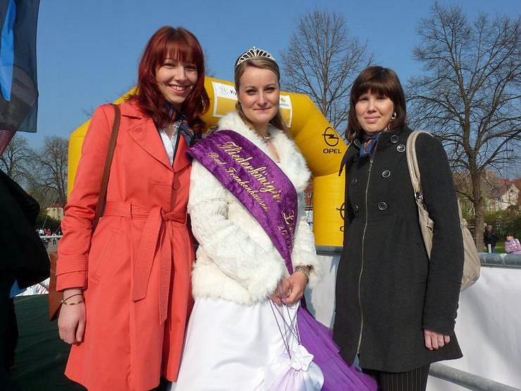 Auch königliche Präsenz war beim Berglauf dabei. Neben der aktuellen Fliederkönigin Linda I. war auch Nicole I. (rechts) dabei, eine frühere Fliederkönigin. Beide Königinnen werden beim 20. Fliederfest sich wieder als Kandidatin bewerben, denn wegen des Jubiläums dürfen dieses Jahr auch die ehemaligen Fliederköniginnen wieder antreten. Keine ehemalige Fliederkönigin war Steffi Nuschler von der Nordthüringer Volksbank, die das Trio vervollständigte.