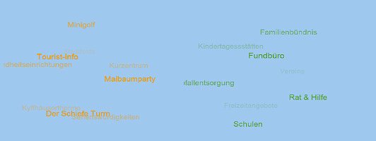 Kurzgesagt, dieser Teil ist zwar eine interessante technische Lösung und etwas für eine Spiele- Seite, aber auf einer Informationsseite über eine ganze Stadt hat so eine Spielerei nach Ansicht von kn nichts, aber auch rein gar nichts zu suchen. Eine Webseite die neu ins Netz gestellt wird, sollte barrierefrei sein, dass heißt, auch dass mit spezieller Software Blinde und sehschwache Menschen auf die Webseite zugreifen können. Bei den Teils kaum zu erkennenden Begriffen und der starken Beweglichkeit kann man wohl kaum von Barrierefreiheit sprechen. Resultat könnte sein, dass deshalb mancher User gleich genervt nach der Startseite die Webseite wieder verlässt.