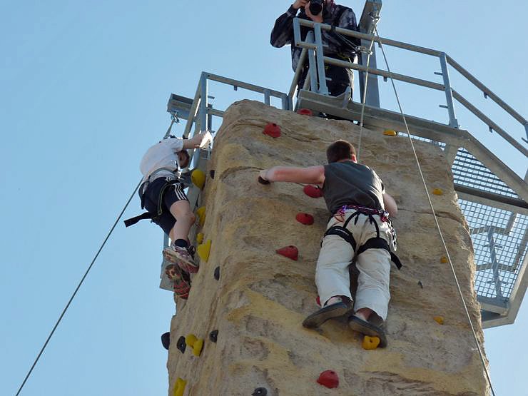Da am Kletterturm immer zwei Kletterer gleichzeitig klettern können, stellt sich natürlich die Frage, wer klettert mit und schon kam wieder die Frage auf, na wer wird denn schneller oben sein. Zufälligerweise war es ein vornamensgleicher Christoph, der mit seiner Hockeymannschaft, Potsdamer Sportunion 04, im Trainingslager hier war. Vor Kletterbeginn hatte Matschie klar gemacht das man nie ohne Klettersicherung sich in solche Wände begeben sollte. Wie wichtig so ein Hinweis war, sollte er bald merken.
