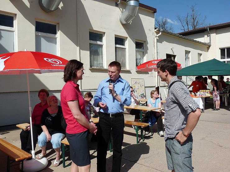 Mit steigenden Temperaturen steigt auch das Interesse am Kletterturm im Ferienpark Feuerkuppe, was das Team um Geschäftsführerin Antje Hochwind jetzt zum Anlass nahm, um die gestrige große Turm - Saison - Eröffnungsparty zu planen und somit die Klettersaison offiziell einzuläuten. Natürlich wünschte der Minister bei der Begrüßung Antje Hochwind, hier mit Michél Kalensee, Leiter Marketing des Ferienparks (re.) viel Erfolg, denn sie bewirbt sich ja in der Stichwahl für die SPD um den Posten des Landrates.