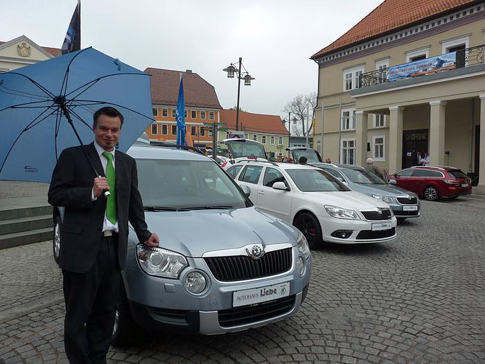 Bei Skoda nahm man das schlechte Wetter zwar zur Kenntnis, aber wir müssen auch sagen, die letzten Jahre hatten wir Glück mit dem Wetter. Und zur Beratung hatte man einen Schirm dabei, damit potentielle Kunden ohne Schirm nicht im regen stehen müssen.