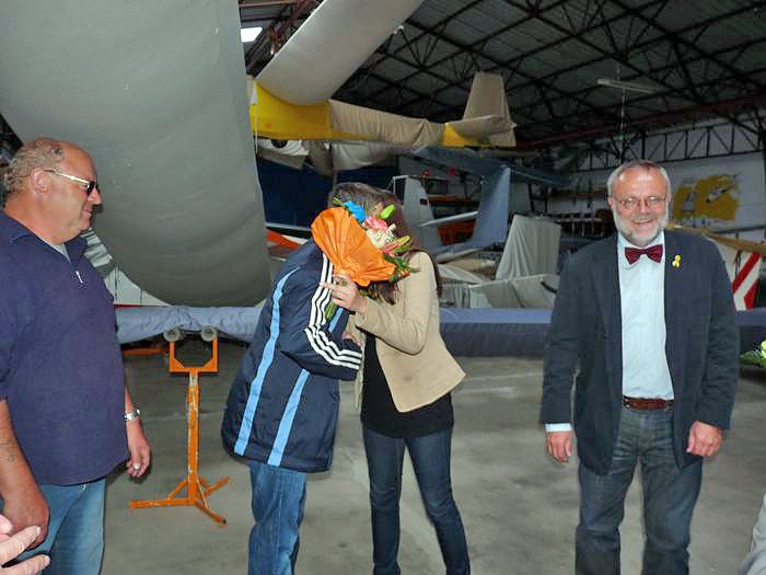 Pech allerdings für den Gewinner Udo Pötzschke aus Bad Frankenhausen, aber gebürtig in Heldrungen, wie er kn sagte. Wegen des schlechten Wetters blieb die Maschine am Boden. Horst Dreischärf, Erster Vorsitzender des Aeroclub "Hans Grade" Bad Frankenhausen e.V., sagte, bei 300 Meter Wolkenhöhe ist so gut wie nichts zu erkennen und der Kyffhäuser könnte wegen der Wolken nicht mal gesehen werden. In einer kleinen Regenpause nahm man aber vor der AN-2 wenigstens Aufstellung. Der bekannteste Flige-Träger des Kreis, Landrat Peter Hengstermann (CDU) richtete dem Gewinner nochmals die Fliege.