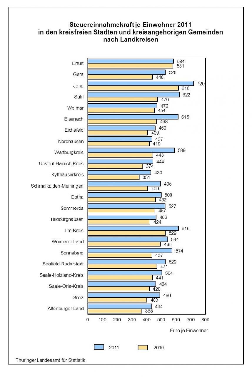 Im Jahr 2011 betrug die Steuereinnahmekraft der 913 Thüringer Gemeinden 1,168 Milliarden Euro. Das waren nach Mitteilung des Thüringer Landesamtes für Statistik 146 Millionen oder 14 Prozent mehr als im Jahr 2010. Je Einwohner entsprach das einem Anstieg von 68 Euro auf nunmehr 524 Euro, den bislang höchsten Betrag für Thüringen.