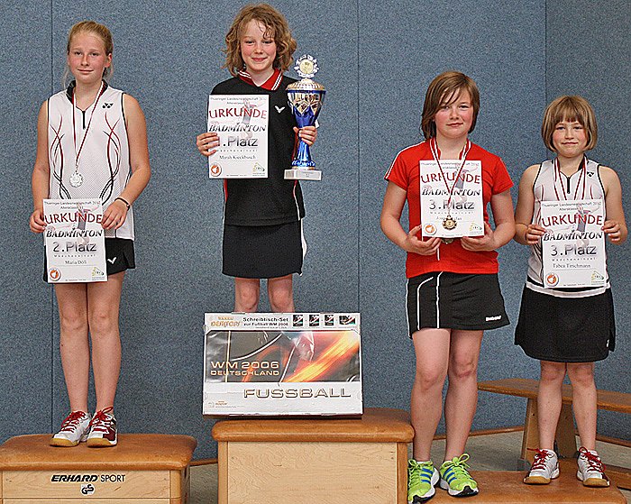 Joana (Foto oben) hatte in ihrem Halbfinale die Überraschung auf dem Schläger, hatte sie doch Maria Döll aus Meiningen nach verlorenem erstem Satz im Zweiten im Griff. Leider konnte sie ihre Linie im dritten Satz nicht beibehalten und musste ihre Gegnerin mit 21:16 ins Finale ziehen lassen. Da holte sich dann aber erwartungsgemäß Marah Kieckbusch, ebenfalls aus Meiningen den Pott.