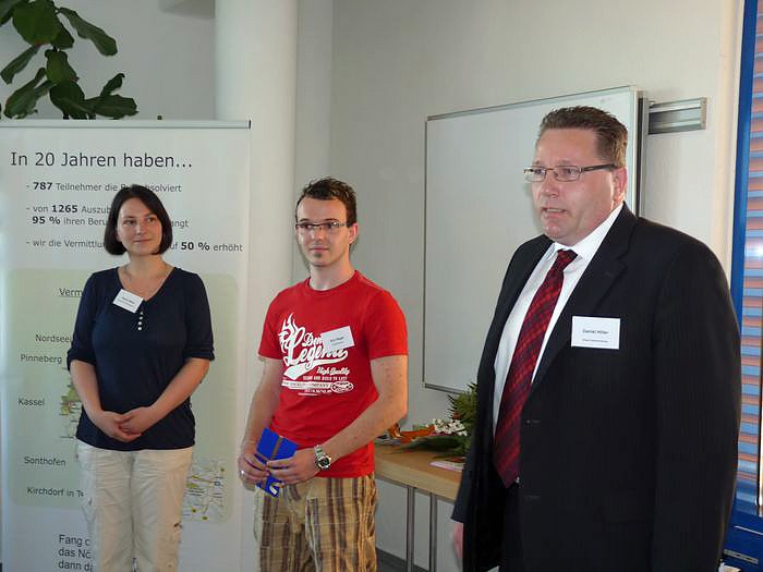 Besondere Würdigung erhielt an dieser Stelle der Projektteilnehmer Eric Nagel, welcher sein Auslandspraktikum mit großem Erfolg absolviert hat. Von der Projektleiterin "LeA - Lernen und Arbeiten in Europa" gab es ein Aufmerksamkeit. Viel wichtiger aber war etwas anderes. Er erhielt ein Chance, sich beruflich zu entwickeln. Von Daniel Hiller, Betreiber einer Allianz-Versicherungsagentur erhielt er eine berufliche Chance, sich zu entwickeln. Eric Nagel aus Ebeleben ist zwar gelernter Bürokaufmann (1,9 Abschluss!), fand aber keinen Arbeitgeber, der einen Mitarbeiter ohne Betriebserfahrung einstellen wollt!!! Eric Nagel bekam das Angebot eine Kundenberaterstelle mit einer weitere Ausbildung als Versicherungsfachmann zu erhalten.