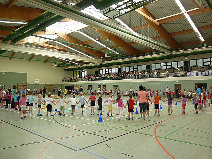 Als am Ende der Veranstaltung sich alle Vorschulkinder und Erzieher in einem riesigen Kreis aufstellten, fragte Moderatorin Sabine Angelstein von der Stadtverwaltung, seid ihr fir für die Schule und es tönte aus 144 Kehlen "Jaaaaaaaaaaa!