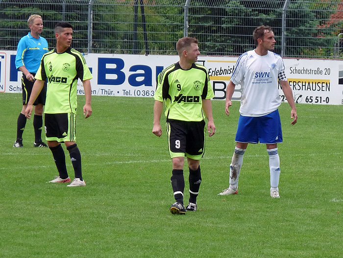 Sebastion Caspar mit der Nummer 9, hier mal als Verteidiger, hatte schon die Tore Nummer 1 und 2 in der 24. und 29. Minute geschossen. Wenn bei kn richtig gezählt wurde, müsste Caspar mit 34 Toren auch Torschützenkönig der Thüringenliga geworden sein.