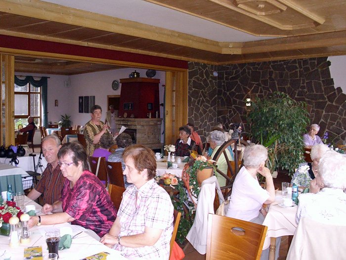 Angekommen an der Wolfsmühle erkundeten wir erst einmal etwas die Umgegend und schauten uns auch das alte Mühlenwasserrad an. Auch Esel, Alpakas und ein Zwergponny Susi bereichern die Außenanlage des Ferienhotels Wolfsmühle. Wir hatten die Kaffeetafel vorbestellt und so war in einem Saal der Hotelgaststätte für uns schon sehr schön eingedeckt worden. Zum Kaffee gab es leckere Kuchen und Torten, wobei einige Senioren bei der Vielfalt wirklich die Qual der Wahl hatten. Heute hatten wir unter den Anwesenden ein Geburtstagskind, das wir mit einem Ständchen und einem zünftigen Korn- und Feldblumenstrauß hochleben ließen. Anschließend nutzten wir die Gelegenheit zu einem ausgiebigen Spaziergang vorbei an dem neu gestalteten Mühlenteich als Naturbadeteich weiter durch die angrenzende Campingplatzanlage. Auch ein paar kleine Nieselregentropfen konnten uns davon nicht abhalten. Auf der gegenüberliegenden Hanglage des Campingplatzes hatten sich auf der Weide Rinder ein schattiges Plätzchen gesucht und kauten genüsslich das saftige frische Gras. Es ist eine Augenweide in dieser farbenprächtigen Natur zu wandeln, alles auf sich wirken zu lassen und die Seele einfach mal baumeln zu lassen. Läuft man den Weg weiter, so ist man nach wenigen Minuten wieder im Ort drin und kann sich dort zum Beispiel weiter umschauen. Leider war die Zeit für unsere Rückfahrt schon gekommen und so traten wir die Heimreise mit vielen harmonischen Eindrücken dieses schönen Nachmittags an. Wir danken allen, die uns bei der Vorbereitung und Durchführung dieses Ausfluges unterstützt haben.