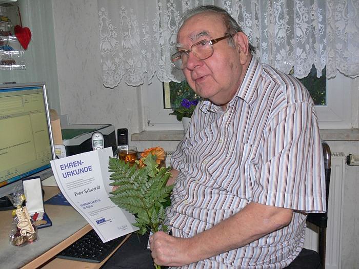 Ausgezeichnet wurde zum Abschluss des offiziellen Teiles noch der Kassenführer Gerhard Stelzner mit der Ehrenplakette des Landesverbands Hessen-Thüringen in Silber. Peter Schwerdt, Schriftführer des Ortsverbandes seit seiner Gründung und darüber hinaus Gestalter der Homepage des Kreisverbandes und dabei besonders der Roßlebener Seiten erhielt die Plakette in Gold. Da er gesundheitlich nicht an der Veranstaltung teilnehmen konnte, besuchte ihn der Vorsitzende Wolf-Jürgen Träger unmittelbar nach der Veranstaltung. Peter Schwerdt freute sich über die Auszeichnung, vor allem aber darüber, dass er nicht vergessen ist, selbst wenn er (hoffentlich nur vorüber gehend) nicht bei den Veranstaltungen dabei sein kann.