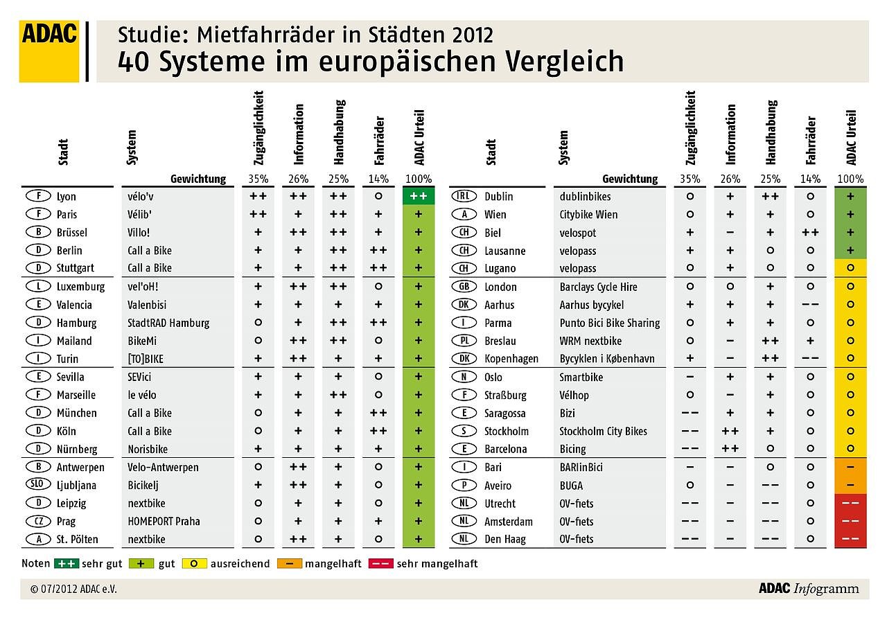 Die Erhebung, die im Rahmen von EuroTest Fahrradverleihsysteme in 40 Städten per Internetrecherche und Anbieterbefragung im Frühjahr 2012 verglichen hat, zeigte auch, dass die Systeme in Deutschland überzeugen. Die Note gut erhielten Call a Bike in Berlin, Stuttgart, München und Köln, das StadtRAD in Hamburg, Norisbike in Nürnberg und nextbike in Leipzig. Bewertet wurden die Zugänglichkeit zum System, das Informationsangebot, die Handhabung an Ort und Stelle sowie die Ausstattung der Räder. Der Verleih über Fahrradgeschäfte, Hotelangebote oder private Kleinanbieter wurde nicht berücksichtigt