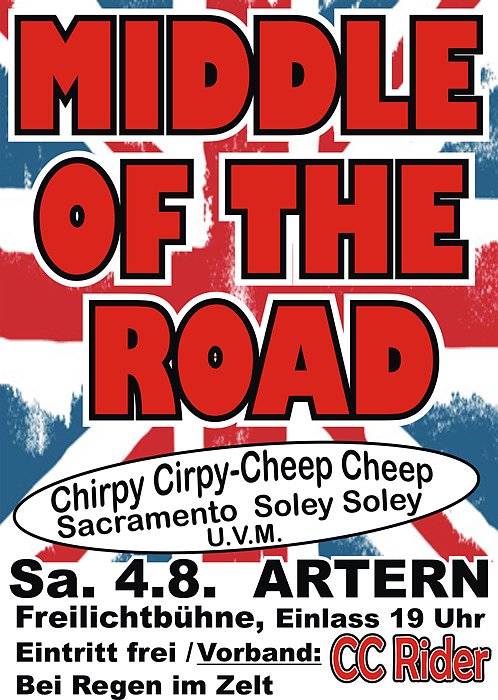 19.00 Uhr CC RIDER Oldies but Goldies, MIDDLE OF THE ROAD die Star-Band der 70er Jahre aus Schottland mit unvergesslichen Hits wie "Chirpy - Chirpy - Cheep Cheep" " Soley Soley" und viele mehr (Eintritt frei)