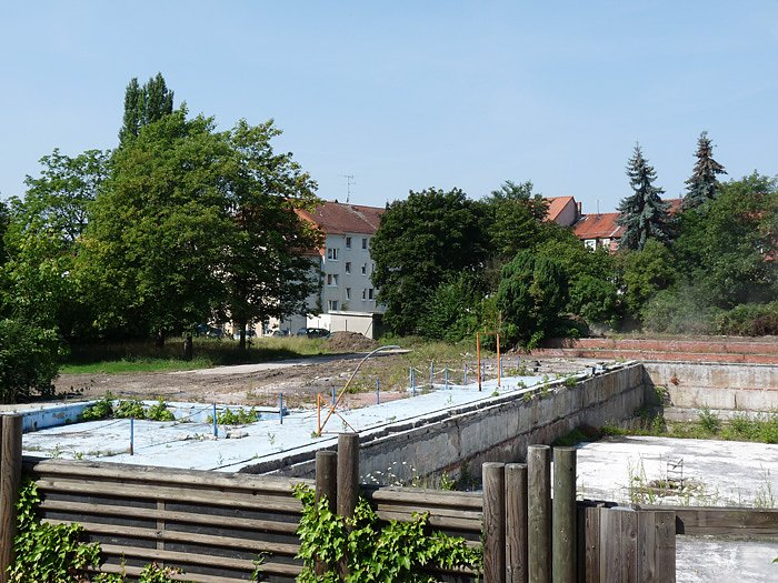 Vor dem Bau der neuen Anlage muss natürlich erst mal Baufreiheit geschaffen werden. Auf der ersten Aufnahme ist der Sprungturm des alten Bades schon nicht mehr zu sehen. Und das Gebäude auf der zweiten Aufnahme (vom letzten Mittwoch) rechts müsste auch bereits verschwunden sein, denn im Juli sollte der Abriss wohl erledigt sein.