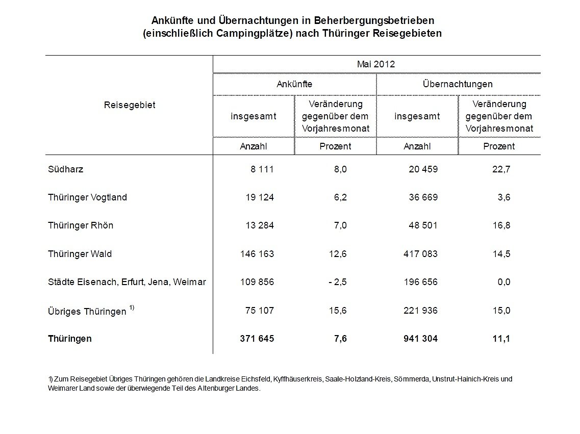 Im Mai 2012 erhöhte sich die Zahl der Gästeankünfte in den Thüringer Beherbergungsbetrieben nach Mitteilung des Thüringer Landesamtes für Statistik gegenüber dem Vorjahresmonat um 7,6 Prozent auf 372.000. Die höchsten Zuwächse verzeichneten die Reisegebiete...