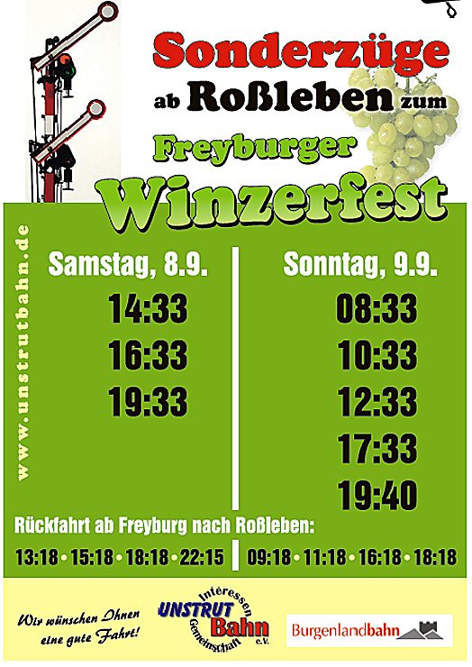 Zum diesjährigen Winzerfest in Freyburg haben wir wieder Sonderzüge, die ab/ bis Roßleben verkehren, bei der Burgenlandbahn bestellt, so die IG Unstrutbahn e.V. gegen über kn.