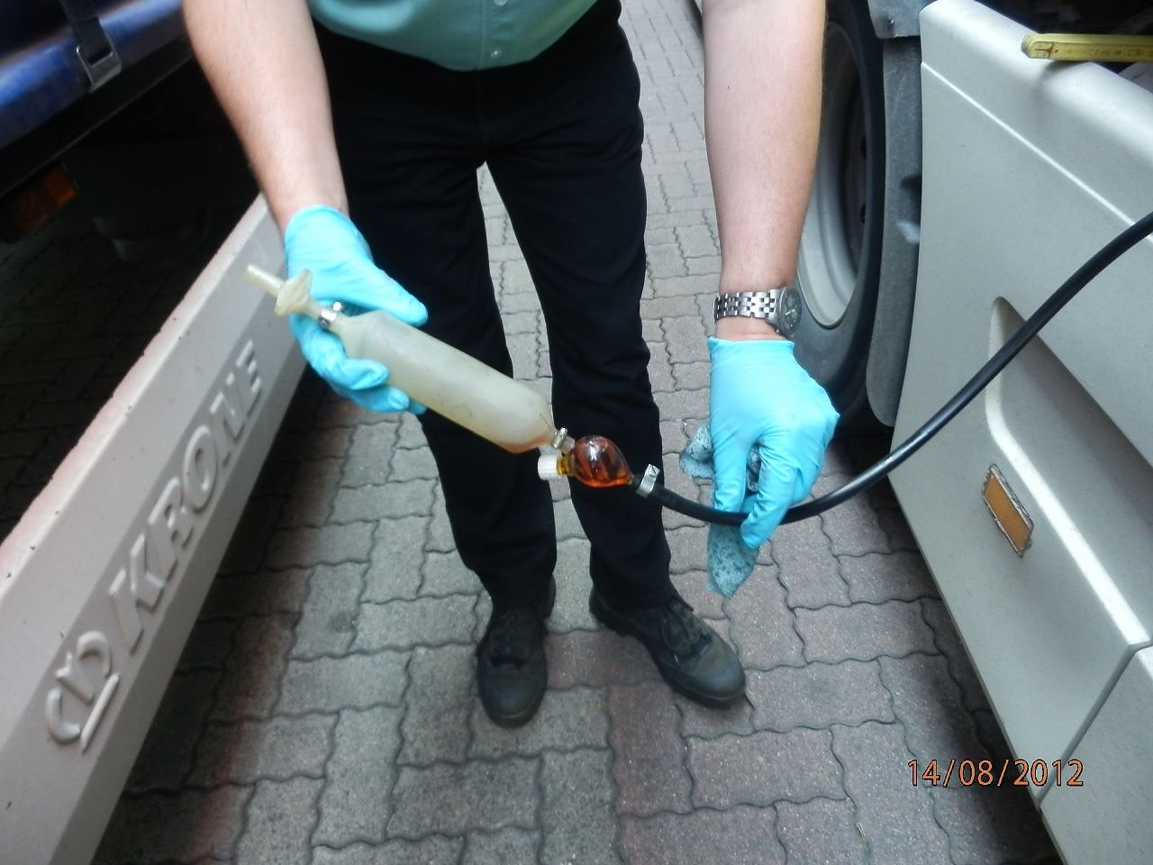 Hintergrund: Kraftstoffkontrollen durch den Zoll funktionieren schnell und unkompliziert. Durch eine Handpumpe werden wenige Milliliter Kraftstoff aus dem Tank eines Fahrzeugs in ein Teströhrchen befördert. Ist der Kraftstoff rot eingefärbt, wissen die Zöllner sofort, dass es sich um Heizöl handelt. Zusätzlich ist Heizöl mit den unsichtbaren Markierstoffen Furfurol und solvent yellow versetzt. Beide Stoffe sind vom Zoll vor Ort durch einen chemischen Schnelltest nachweisbar.