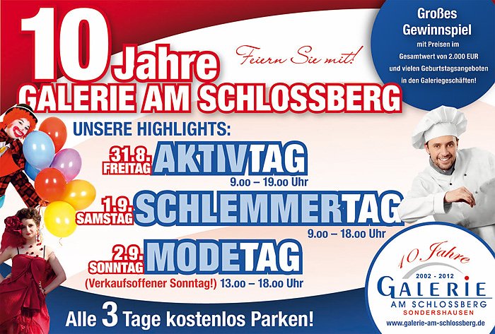Wir freuen uns auf viel Resonanz und zahlreiche Besucher zum Galeriegeburtstag und parallel verlaufenden Weinfest. Am Sonntag, 2. September 2012 haben alle Geschäfte der GALERIE AM SCHLOSSBERG und der Innenstadt von 13 - 18 Uhr für ihre Kunden geöffnet.
