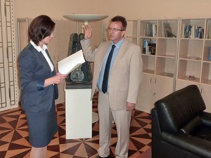 Am späten Vormittag des 31.08.2012 nahm Landrätin Antje Hochwind (SPD) ihrem neu gewählten Ersten Kreisbeigeordneten Holger Häßler gemäß Thüringer Beamtengesetz den Diensteid ab.