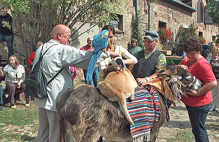 Eine Attraktion besonderer Art war die Schau selterner Haustiere der Region. So zeigt der Falkner, Herr Möllhoff, aus Bottendorf zwei Falkenarten und einen Uhu, das Ehepaar Gottschall ihren schon durch Medien bekannt gewordene Papageien-Dame Daisy und Herr und Frau Nohle aus Sangerhausen das schon häufig aufgefallene Frettchen Vicky. Die Eselin Brunhilde mit Frau Bieling, ebenfalls aus Bottendorf, war wieder dabei. Der Töpfer Ingo Naundorf aus Mönchpfiffel bringt sein kleines Wildschwein mit. Und das Tierheim aus Gehofen stellt einen lieben Hund und eine zahme Katze zur Verfügung.