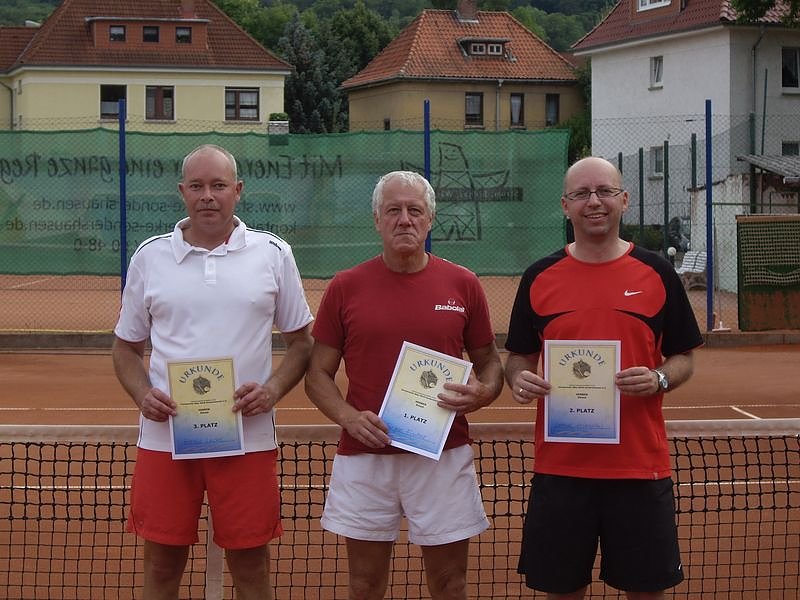 Das Finale war eine recht einseitige Begegnung, in welcher Jürgen Fischer beim 6:2 und 6:2 seinem Kontrahenten nicht den Hauch einer Chance lies und souverän Vereinsmeister wurde. Das Spiel um Platz 3 war an Dramatik und Hochspannung allerdings kaum zu überbieten. Im ersten Satz spielte Marvin phasenweise hochklassiges Tennis und brachte Harald immer wieder zur Verzweiflung. Im zweiten Satz allerdings musste er dann dem hohen Tempo und den bereits absolvierten Spielen Tribut zollen. Der Champions-Tie-Break musste hier entscheiden. Und in dem hatte Harald etwas mehr Glück auf seiner Seite und spielte mit mehr Konzentration. Am Ende siegte er mit 3:6, 6:3 und 7:6 und holte sich so den Bronze-Rang.