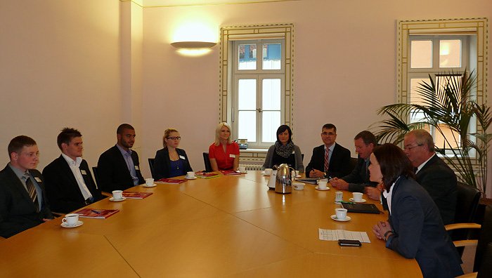 Im Anschluss an den Fototermin ging es mit Dr. Thiele für die Auszublidenden weiter. Hier gab es Erläuterungen zu Struktur des Hauses , sowie Zweck und Aufgaben der öffentlichen Verwaltung.