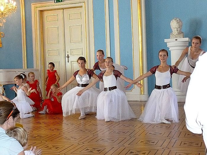 Auf Holzböden tanzten die Tänzerinnen der Tanzschule Radeva im Blauen Saal zu bekannter Musik( z.B. Coppelia) und im Riesensaal zeigte die historische Tanzgruppe mit Frau Kutscha das Märchen "Kalif Storch".Im Kellergewölbe hatte man Zugang zum Kerker- Kopf einziehen, der Türbalken ist niedrig. Wieder das Holz!
