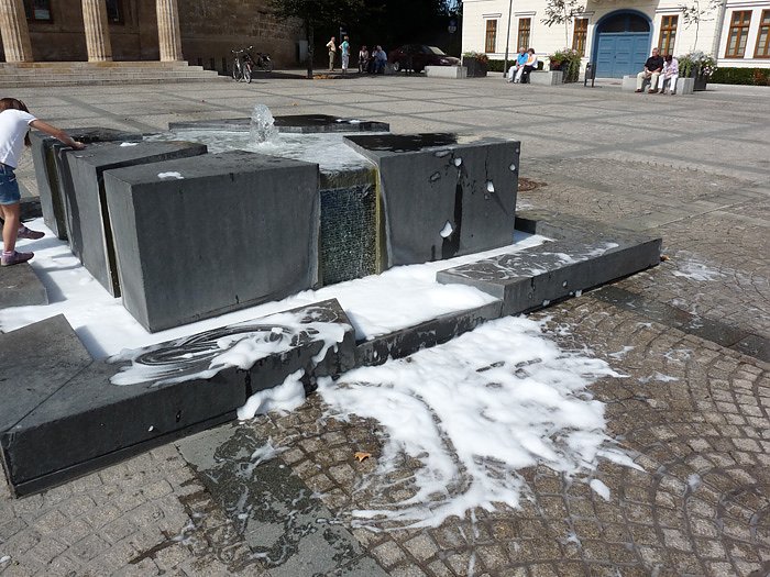 Witzbolde hatten am Sonntag wieder mal Spülmittel in den Brunnen auf dem Markt geschüttet. Rest waren noch am Mittag zu finden.