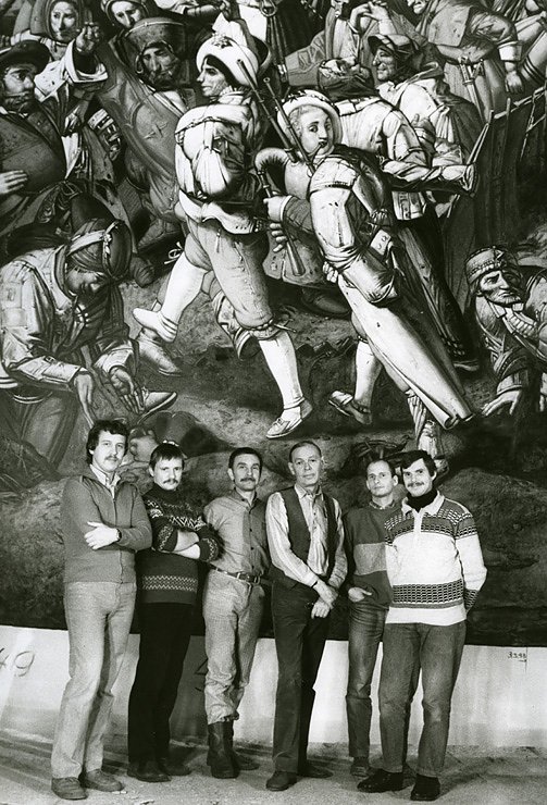 Eberhard Lenk, Andreas Katzy, Helmut Felix Heinrichs, Werner Tübke, Matthias Steier und Volker Pohlenz (v.l) vor dem Panoramagemälde, Archiv Panorama Museum