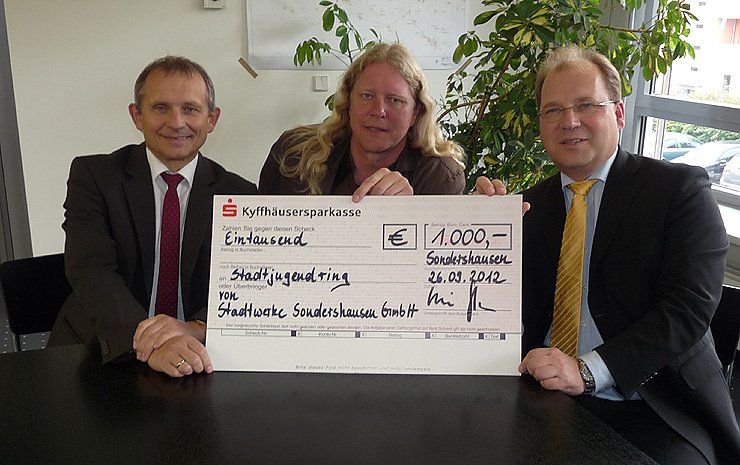 Die Übergabe des Spendenschecks in Höhe von 1.000,00 EUR an den Geschäftsführer des Stadtjugendring Sondershausen e.V., Andreas Gothe, erfolgte durch die Geschäftsführer der Stadtwerke Wilhelm Schreier (li) und Hans-Christoph Schmidt (li).