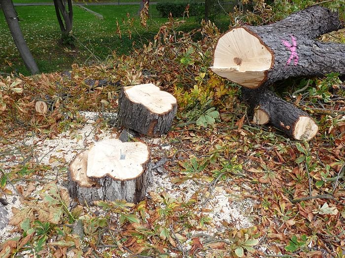 Ein Baum wurde ganz gefällt. Von der Baumscheibe her ist für einen Laien keine Schädigung zu erkennen. Auch viele abgeschnittene Äste zeigen keinerlei Krankheitsspuren.