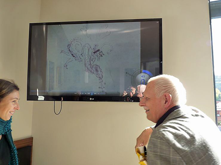 Thema des Gesprächs war natürlich nicht nur die Biografie. Thema war auch der Grafiker Mackensen, der zum Beispiel auch Trickfilme illustriert, was sicher nicht so bekannt ist. Ein Trickfilm lief auf dem Bildschirm ab. Aber auch über die im Café des Gästehauses ausgestellten Werke wurde gesprochen.