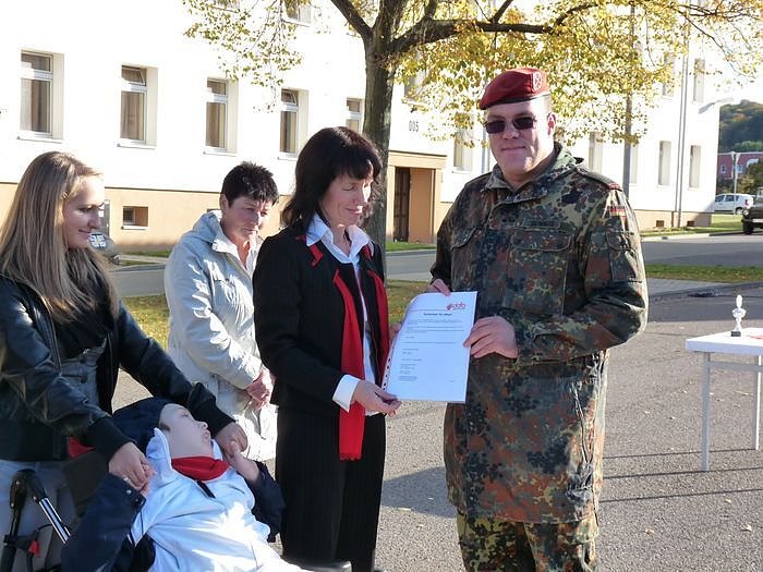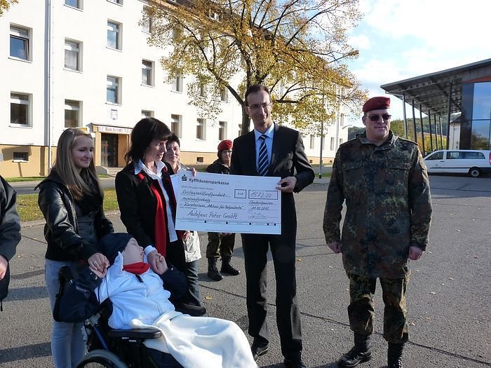 Verkaufsleiter Jörn Bierwisch vom Autohaus Peter aus Nordhausen übergab im Beisein von Kommandeur Oberstleutnant Armin Schaus einen Scheck von 1.572.20 Euro an die Familie von Albert. Ohne dem Ergebnis von heute wurden in den letzten zehn Jahren 252.758 Bahnen geschwommen, und dadurch Spenden in Höhe von 14.038,52 Euro gesammelt.