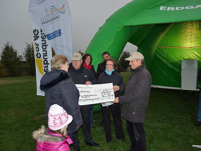 Aber nicht nur Gas kam heute nach Sondershausen. Als Dank für die Bürger und einiger Unannehmlichkeiten die solche Baustellen nun mal mit sich bringen, gab es einen Scheck über 250 Euro für den Heimat- und Geschichtsverein Oberspier, deren Vorsitzende, Erika Müller, sofort verkündete, das Geld kommt dem Kindergarten zu Gute.