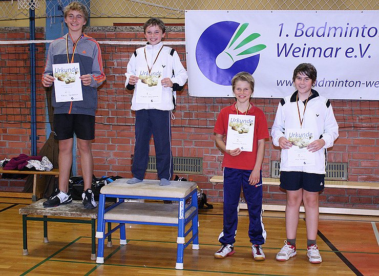 Titel für Florian bei den Bezirksmeisterschaften der AK15 Nordthüringen im Badminton. Die hoch gehandelten Jungs aus der Landershauptstadt mussten ebenso zum Sieg gratulieren, wie der 3 Jahre ältere Kiril Georgiev aus Niederroßla.