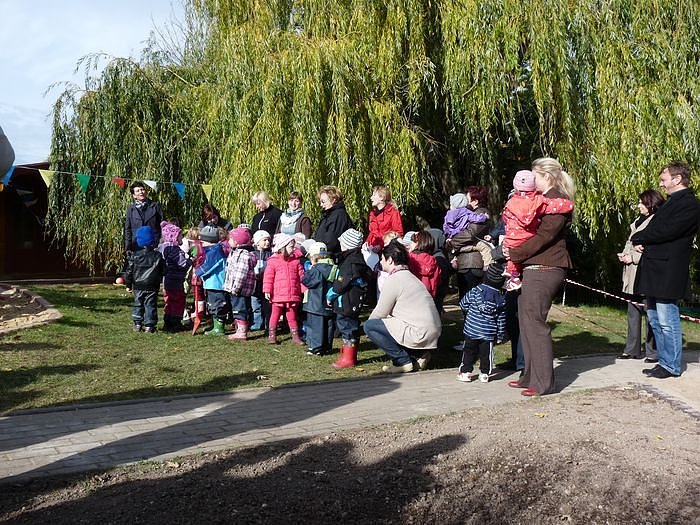 Nach Liedern der Kinder und der Danksagung an alle Sponsoren, schnitt Sandra Koch, die Vorsitzende der Elternvertretung das Band durch, das die schon neugierig wartenden Kinder von der Arche Noah trennte.