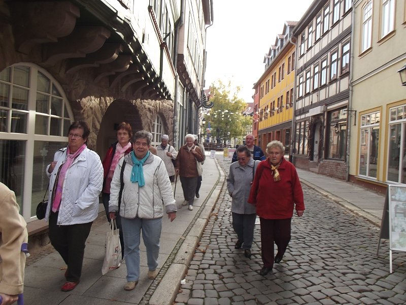 Wir hatten uns für eine Führung angemeldet und so begleitete uns Frau Wulf durch die 1200jährige Geschichte von Nordhausen. Einige unserer Senioren sind gebürtige Nordhäuser und auch noch in der Stadt aufgewachsen und so wurden manche Erinnerungen wieder wach an gute aber auch von schlechte Zeiten. Ich denke hier unter anderem an die Bombardierung im April 1945 und auch an die schlechten Nachkriegszeiten. Auch unser Mitglied Elfriede Ulmann konnte davon aus eigener Vergangenheit lebhaft berichten.