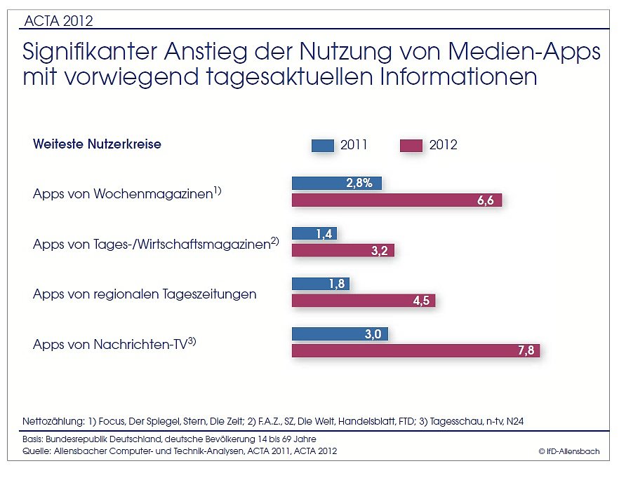 Besonders bemerkenswert ist die Ausweitung der Nutzerkreise von Medien-Apps mit vorwiegend tagesaktuellen Informationen, die im Vergleich zum Vorjahr signifikant angestiegen sind. So nutzten vor einem Jahr erst 2,8 Prozent der Bevölkerung die Apps von Focus, Der Spiegel, Stern und Die Zeit; heute sind es mit 6,6 Prozent fast zweieinhalb mal so viele, die zum Weitesten Nutzerkreis dieser Medien gehören. Auch die Apps von (überregionalen) Tages- bzw. Wirtschaftszeitungen, regionalen Tageszeitungen sowie