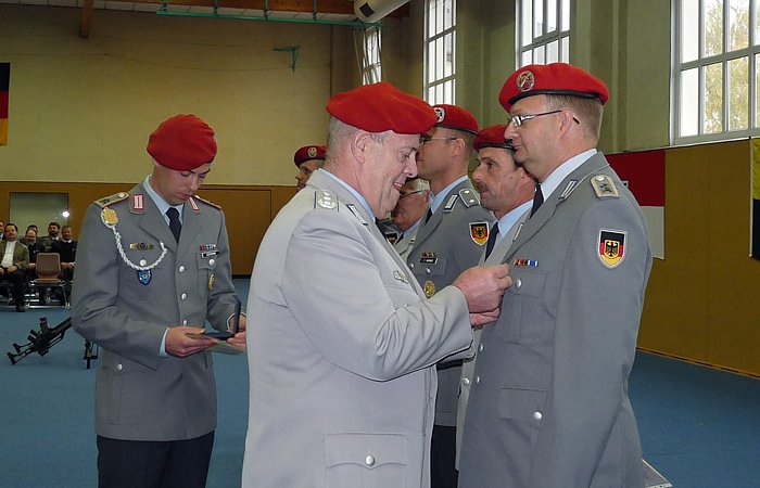 Zum Abschied zeichnete er sechs seiner Soldaten für überdurchschnittliche Leistungen aus. Im Bild erhält gerade Stabsfeldwebel Olaf Engel das Ehrenkreuz der Bundeswehr in Gold für beispielhafte Erfüllung der Soldatenpflicht.