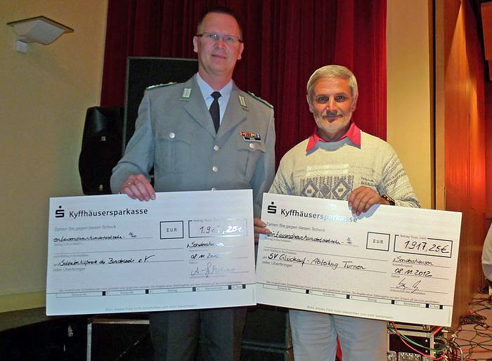 Dann übergab Oberstleutnant Schaus einen Scheck über ebenfalls 1.917,25 Euro an Werner Hofmann vom SV Glückauf Sondershausen Abteilung Turnen. Bei den Turnern müssen immer wieder mal Geräte angeschafft werden, die mächtig ins Geld gehen, hatte Bürgermeister Kreyer bereits bei der Begrüßung des Konzerts hingewiesen. Tipp des Bürgermeisters: Weihnachtsturnen nicht verpassen.