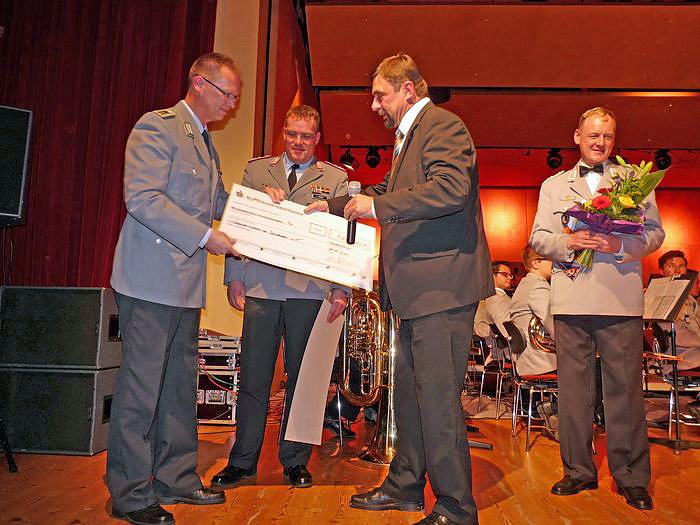 Als erster übergab Bürgermeister Kreyer einen Scheck über 1.917,25 Euro an das Soldatenhilfswerk der Bundeswehr. Den Scheck übernahm stellvertretend Oberstabsfeldwebel Biehl. Kameradschaftshilfe ist das Leitbild des Soldatenhilfswerkes der Bundeswehr e.V. Seit über 50 Jahren leistet es in diesem Sinne schnelle und unbürokratische Hilfe für Soldatinnen und Soldaten, die unverschuldet in Not geraten sind. Dieses Geld wird durch Spenden oder solche Konzerte aufgebracht.